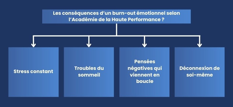 A l’Académie de la Haute Performance, nous ne sommes pas médecins. Toutefois, ce dont nous sommes sûrs, c’est qu’un burn-out émotionnel va engendrer une charge émotionnelle. Cette dernière peut en quelque sorte :