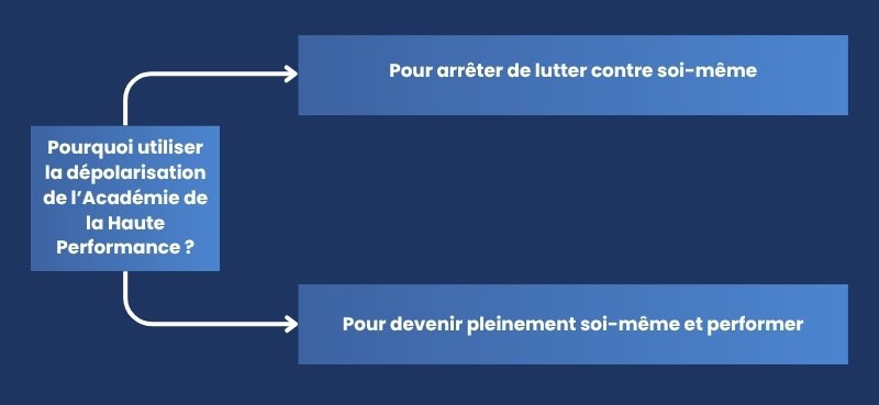 D’où l’importance clé de l’alignement intérieur. Et c’est là que la dépolarisation de l’Académie de la Haute Performance entre en jeu. Grâce à cette approche d’entrainement mental du sportif, vous allez accepter vos blocages et comprendre leurs messages. Vos peurs vont devenir une force pour vos.
